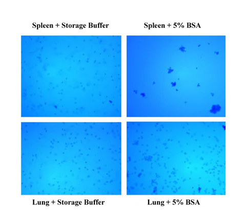 Comparison of the Storage Buffer with 5% BSA in PBS for Anti-Clumping Efficacy. Nuclei of frozen mouse spleen and lung tissues were isolated by Nucleus Isolation Kit for Tissues/cells (Cat# SN-047, Invent Biotechnologies, Plymouth MN). The isolated nuclei pellets were resuspended in 0.4 ml nuclei storage buffer or 0.4 ml 5% BSA in PBS and incubated at 4oC overnight. The nuclei were resuspended by vortexing briefly and stained with trypan blue to compare the nuclear morphologies.