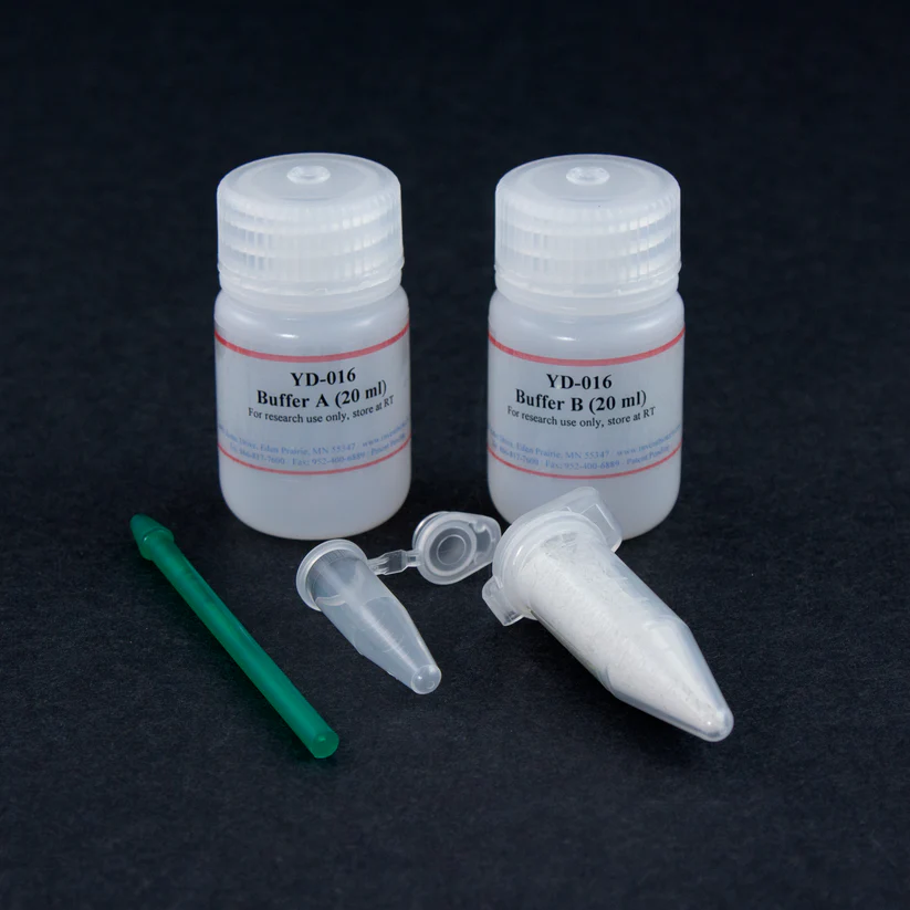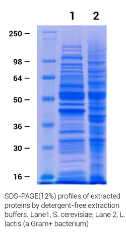 Protein extraction from cell-wall-containing microbes is a common procedure. The methods for protein extraction are usually harsh, tedious and unreliable. YD-016 provides a detergent-free, rapid and gentle way for extracting proteins from microbes with thick and strong cell walls. These microbes include yeast, filamentous fungus, gram-positive and -negative bacteria, insect eggs, microalgae and more. This kit contains optimized detergent-free and EDTA-free protein extraction buffers. The whole procedure takes less than 10 minutes and the protein yield is in the range of 2-4 mg/ml with unbiased protein representation. This kit contains a single-tube protocol and works well for both log-phase and stationary-phase microbes. The materials provided are sufficient for 50 extractions.