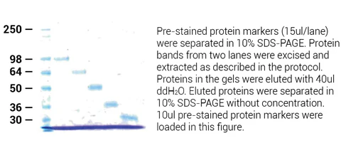 Passive elution and electroelution are the most common methods for extracting proteins/nucleic acid from polyacrylamide/agarose gels. Protein extraction by passive elution usually takes overnight incubation. Eluted proteins are significantly diluted and require further concentration. Protein extraction by electroelution is faster (30 minutes to 2 hours) than passive elution, but it requires a special elution device that works less effectively for larger proteins (>70 kDa). The electro buffer usually contains detergent and other chemicals at a concentration that may interfere with downstream applications. Here we feature a rapid and instrument-free protein/nucleic acid extraction kit. Proteins/nucleic acid can be extracted from gels in less than 10 minutes with a high yield. The elution buffer can be a detergent-containing buffer or pure water depending on the method of gel staining. The elution volume is between 10 and 200 µl. Multiple gel pieces can be processed in a single tube, and the final protein concentration is relatively high.