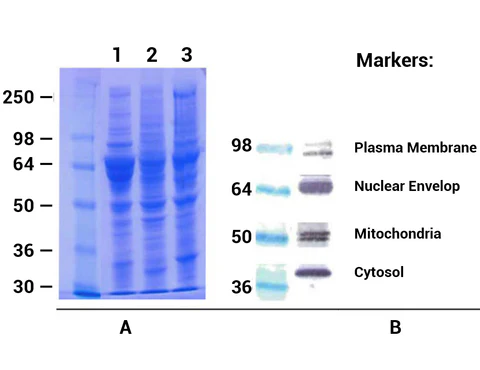 Anti-Na/K ATPase alpha1, a plasma membrane marker (Upstate, clone 464.6), anti-lamin B1, a nuclear envelope marker (ab16048, abcam Cambridge, MA), anti-ubiquinol-cytochrome C reductase core protein (abcam, ab 96333) and GAPDH, a cytosolic marker (Sigma). The specific protein bands were visualized by a substrate Opti-4CN (Bio-RAD).