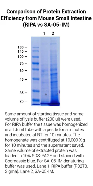 The intestines are a long and continuous tube that run from stomach to anus. Mesentery is a fold of tissue that attaches intestines to the body wall. Structurally, intestines and mesentery are very different. However, from a protein extraction point of view, they have one thing in common: they are very tough and hard to homogenize. It is also very difficult to lyse cells in the tissues for total protein extraction. Traditional solution-based protein extraction methods, such as RIPA, are inefficient and the protein yield is very low. The profile of extracted protein using traditional methods is usually incomplete. This kit provides a highly efficient method for total protein extraction from human or animal intestines and mesentery tissues using a combination of mechanical extraction and chemical lysis. The cell lysis buffers used are much stronger than RIPA buffers. The kit features a simple, fast single-tube protocol and optimized buffers for intestine and mesentery tissues. Researchers have the option to choose either a denaturing or native cell lysis buffer for specific downstream applications. The whole procedure takes less than 10 minutes to complete and the protein yield is in the range of 1-3 mg/ml. The materials provided are sufficient for 50 extractions.
