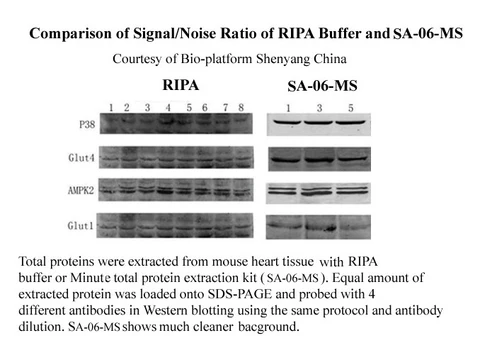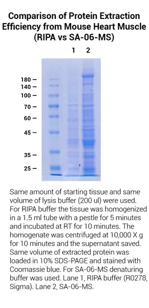 Skeletal and cardiac muscles are highly specialized tissues that are made of well-arranged muscle fibers. An individual muscle may be made up of hundreds or even thousands of muscle fibers bundled together and wrapped in a connective tissue covering. The unique organization of the muscle tissue makes it very hard to homogenize. It is also very difficult to lyse cells in the tissue for total protein extraction. Traditional solution-based protein extraction methods, such as RIPA, are inefficient and the protein yield is low. The profile of extracted protein using traditional methods is usually incomplete. This kit provides a highly efficient method for total protein extraction from human/animal skeletal or cardiac muscle tissues using a combination of mechanical extraction and chemical lysis. The cell lysis buffers used are much stronger than RIPA buffers. The kit features a simple, fast single-tube protocol and optimized buffers for muscle tissues. Researchers have the option to choose either a denaturing or native cell lysis buffer, which is specifically tailored for muscle tissues. The whole procedure takes less than 10 minutes to complete and the protein yield is in the range of 2-10 mg/ml. The materials provided are sufficient for 50 extractions.