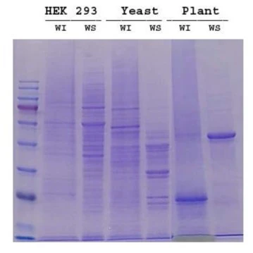 Fig. 1. Protein profiles of water-insoluble (WI) and water-soluble (WS) fractions from HEK293 cells, yeast (S. cerevisiae) and plant (Broccoli leaf). Proteins were separated in 10% SDS-PAGE and stained with Coomassie blue.