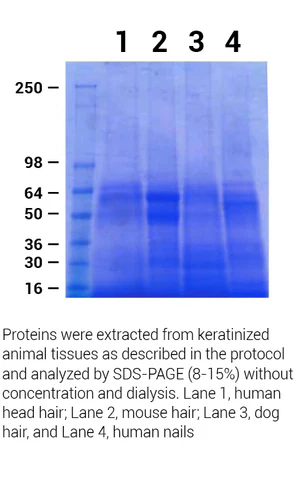 Proteins account for about 80% of keratinized animal tissues such as hair, nail, horn and wool. These tissues contain mainly hard keratins made of several distinct types of protein with a molecular weight ranging from 10 to 135 kDa. The extraction buffer usually contains a high concentration of urea, thiourea, guanidine hydrochloride or a combination of these strong denaturants. Protein extraction with high concentration denaturants is relatively effective, but because of larger extraction buffer/tissue ratio, the concentration of extracted protein is usually low. Extracted proteins need to be concentrated prior to further analysis. The presence of high-concentration denaturants may also interfere with downstream application. HD-021 is designed to effectively extract proteins from keratinized animal tissues without using strong denaturants. The extracted protein can be directly loaded onto SDS-PAGE without concentration. The extraction buffer of this kit contains 0.5% SDS and other chemicals. Extracted protein concentration is 1-2 mg/ml.